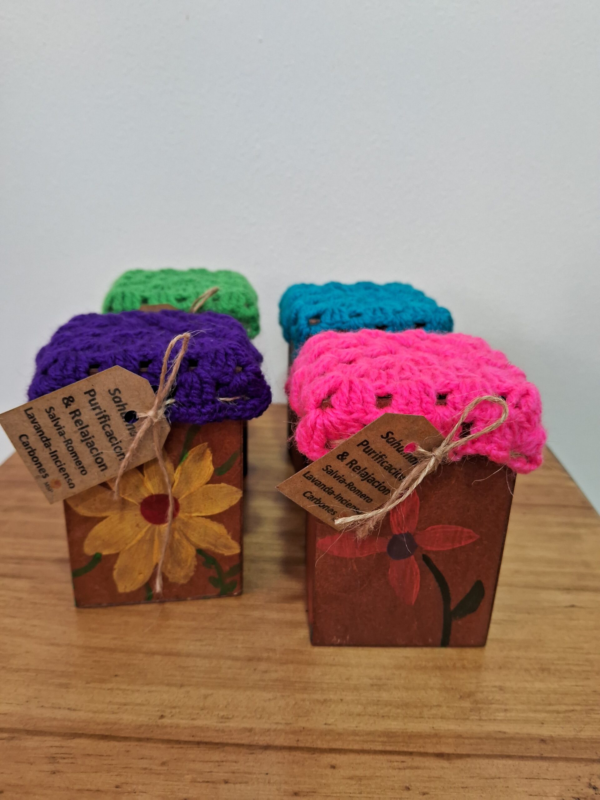 La caja es de madera decorada a mano con diseños florales, y su tapa tejida en crochet aporta un toque cálido y único. Perfecto para regalar o incorporar en tus rituales diarios.