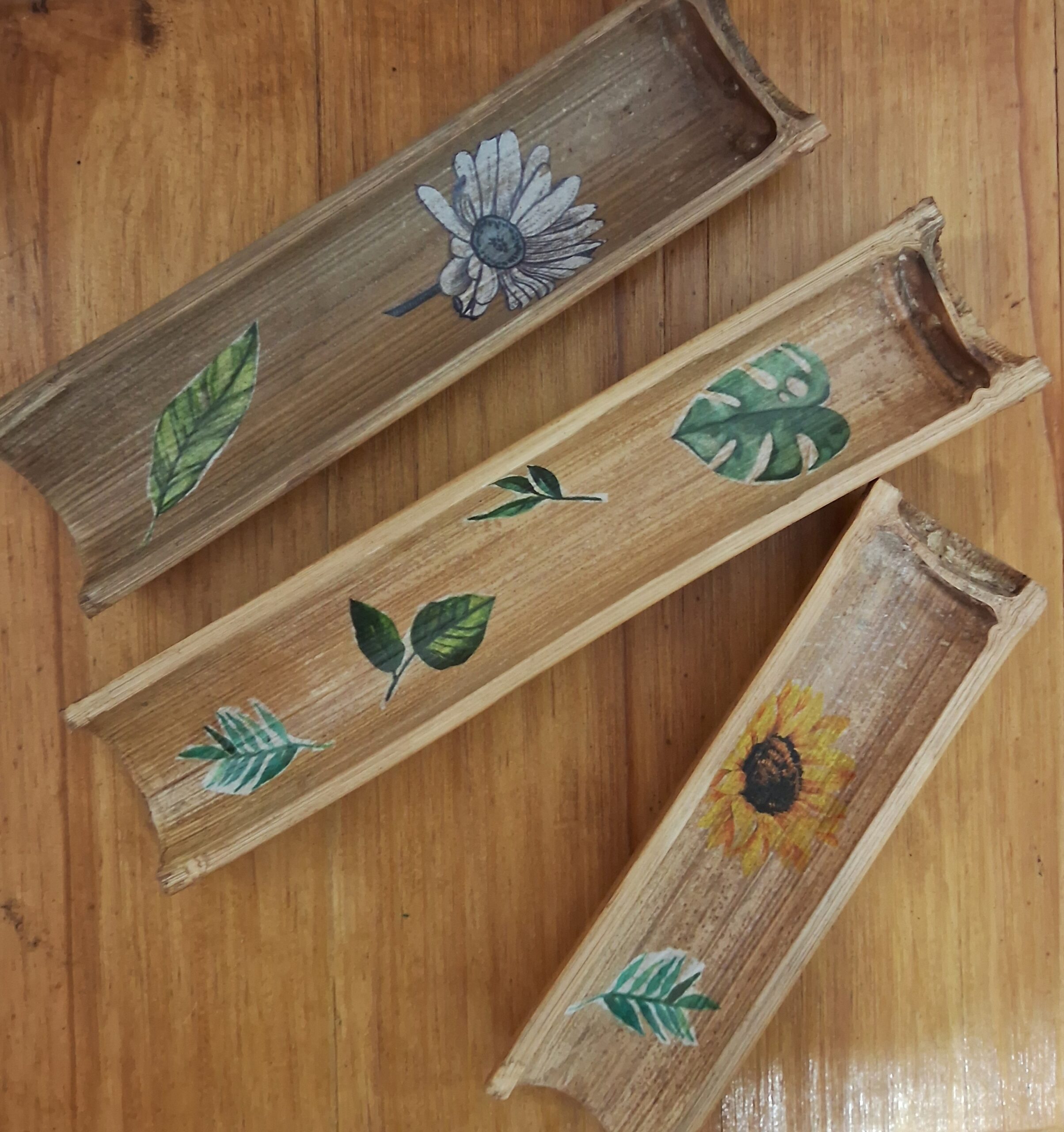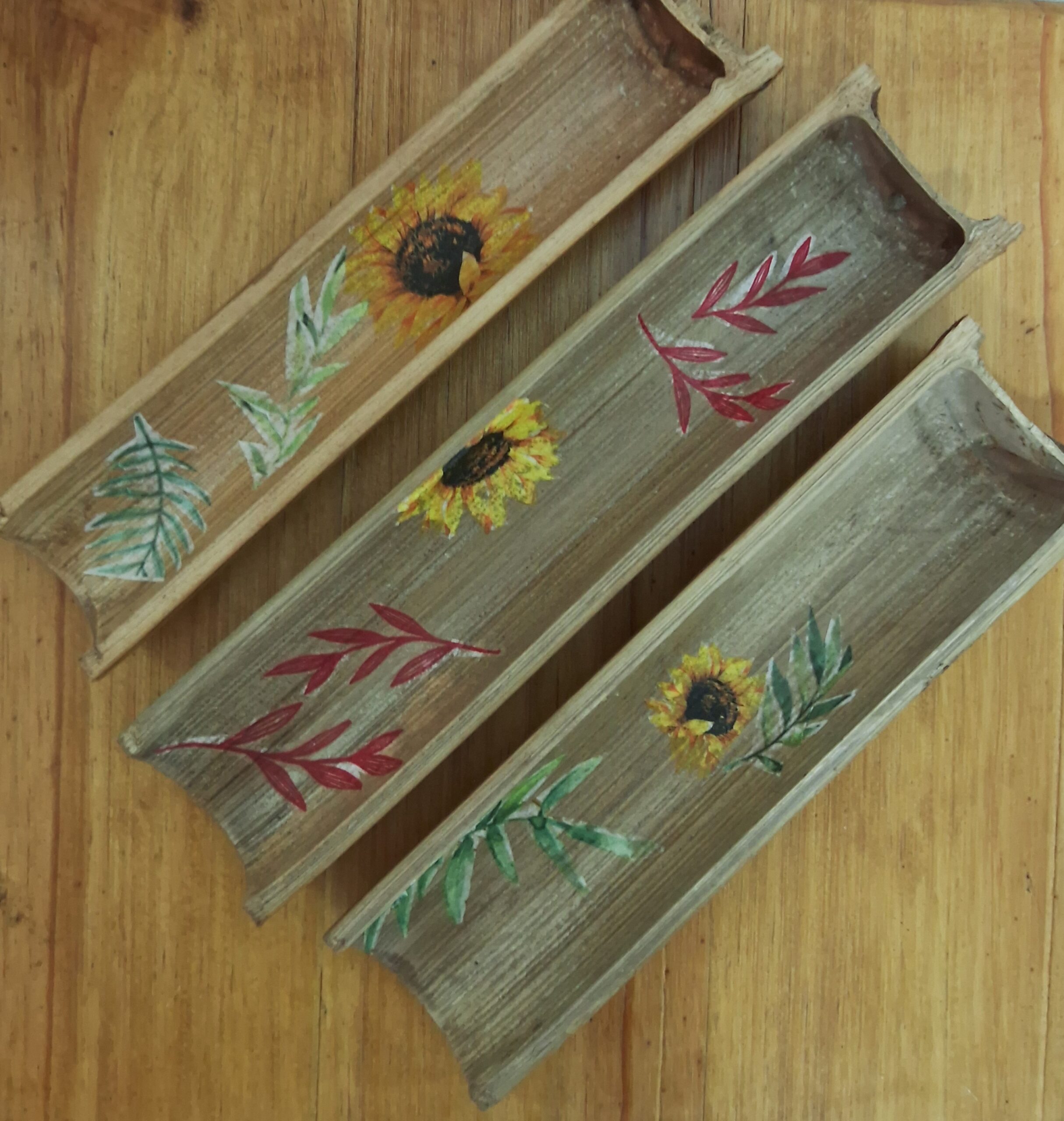 Porta sahumerios elaborados en bambú natural, con diseños que incluyen flores y hojas coloridas. Perfectos para sahumerios en varilla, son livianos, resistentes y aportan un toque cálido y natural a cualquier espacio.